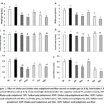 The effects of polyphenol extract and dietary fiber of the pulp, juice and seeds of Khalas and Sukkari date varieties on the weight gain, food intake, and food efficiency ratio of rats are shown in Figure 1A-E.