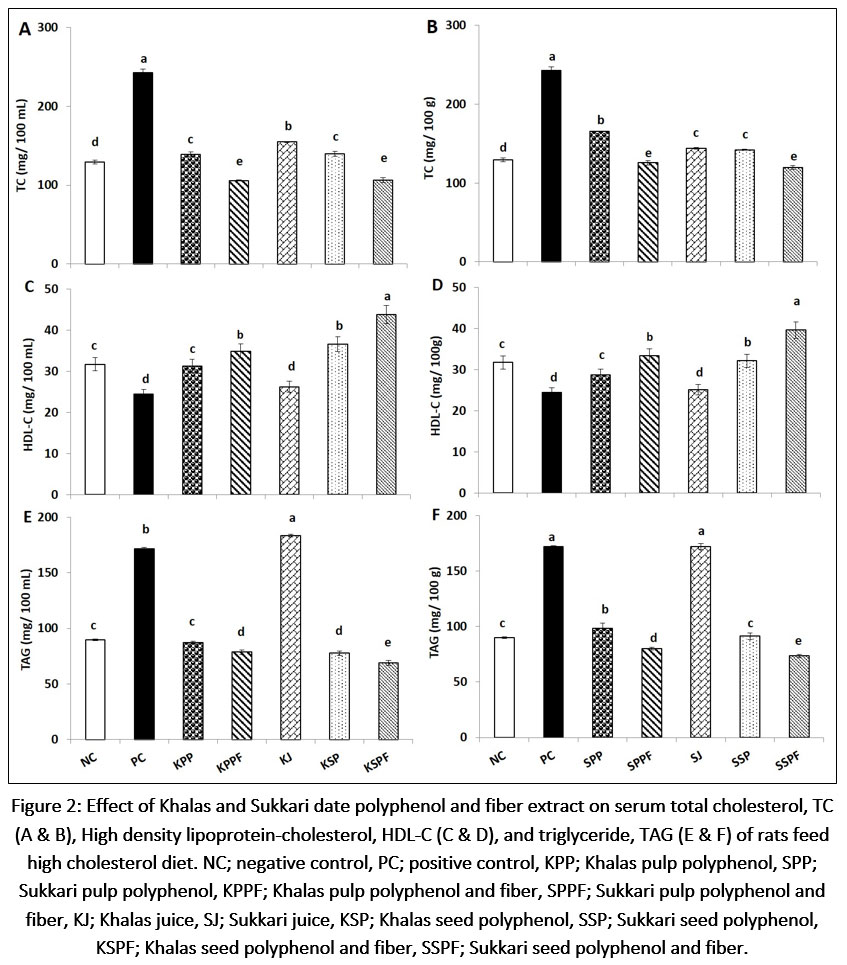 In this regard, the current study was aimed to assess the impact of the polyphenols and fiber extracts of Sukkari and Khalas date fruit pulp, seeds, and juice on lipid profile, antioxidant enzymes activity, inflammatory markers of rat fed cholesterol-rich diet.