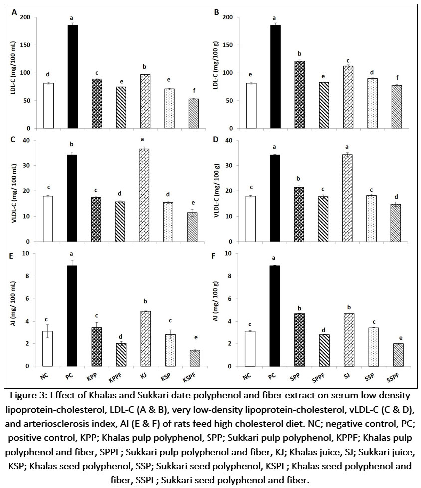 Figure 3: Effect of Khalas and Sukkari date polyphenol and fiber extract on serum low density lipoprotein-cholesterol, LDL-C (A & B), very low-density lipoprotein-cholesterol, vLDL-C (C & D), and arteriosclerosis index, AI (E & F) of rats feed high cholesterol diet. |