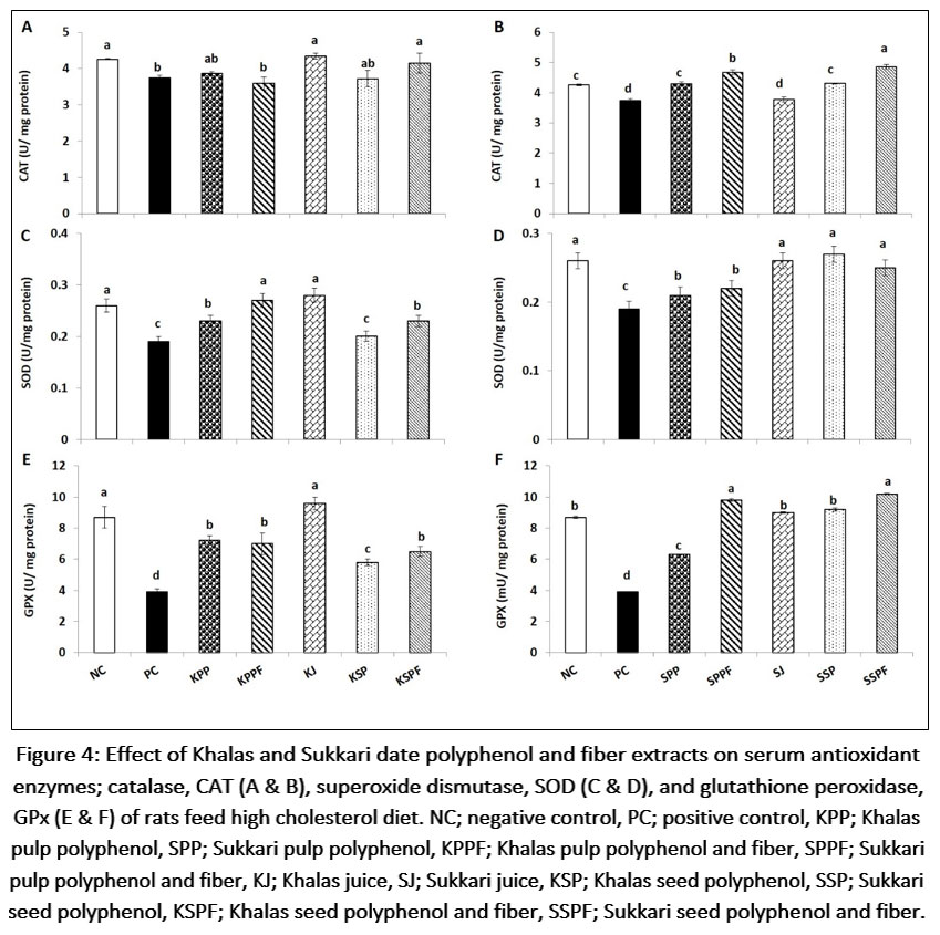 The results on the antioxidant enzymes in the serum of hypercholesterolemic and non-hypercholesterolemic rats fed with Khalas and Sukkari date polyphenol and fiber extracts are shown in Figure 4A-E.