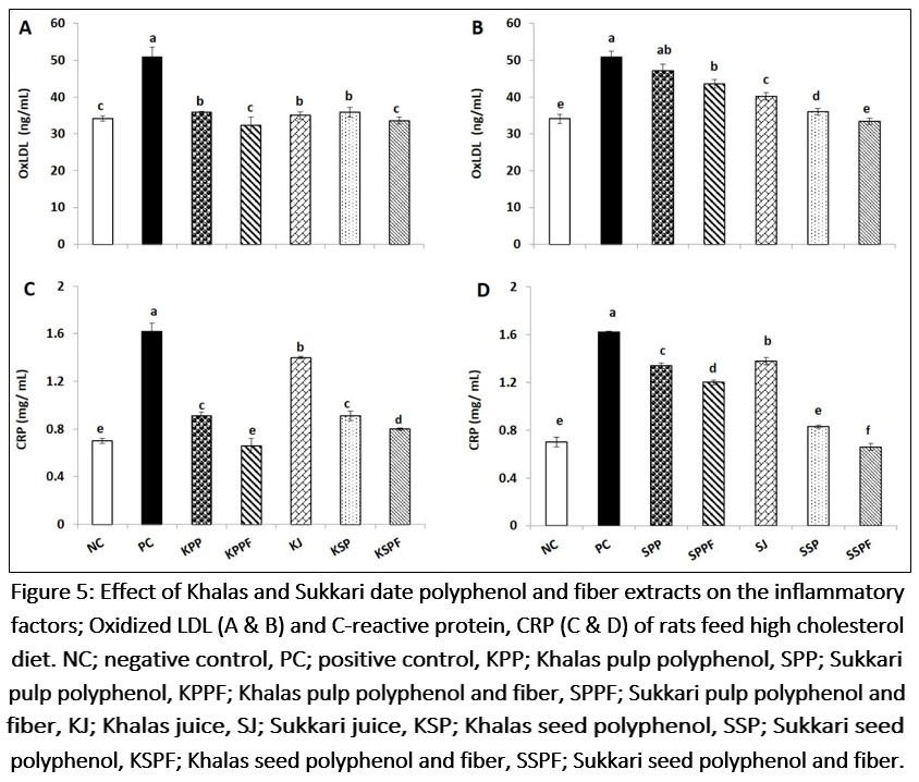 The highest levels of oxidized low-density lipoprotein (OxLDL) and C-reactive protein (CRP) were seen in hypercholesterolemic rats (PC) group compared to non-hypercholesterolemic rats (NC) indicating that feeding rats on high cholesterol diet increased the levels of these inflammatory markers and induced inflammation in rats. Feeding hypercholesterolemic rats with Khalas and Sukkari date pulp, seeds, and juice polyphenols and fibers significantly (P<0.05) reduced the levels of OxLDL and CRP. The highest reduction of OxLDL was observed in the serum of KPPF, KSPF, and SSPF rat groups and that of CRP was seen in serum of KPPF and SPPF rat groups. These findings indicated that feeding hypercholesterolemic rats with date pulp and seed polyphenols plus fibers lowered the OxLDL and CRP levels and decreased the negative impacts of these inflammatory inducing markers on health.