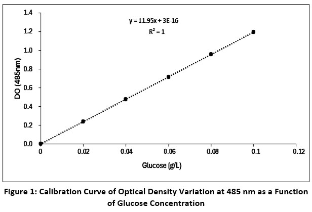 Figure 1: Calibration Curve of Optical Density Variation at 485 nm as a Function of Glucose Concentration |