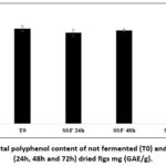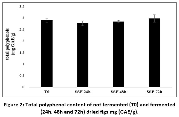 Figure 2: Total polyphenol content of not fermented (T0) and fermented (24h, 48h and 72h) dried figs mg (GAE/g). |