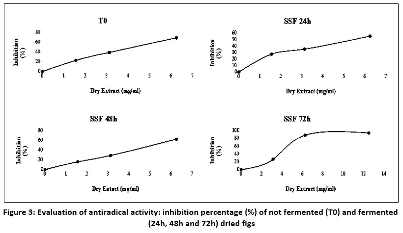 Figure 3: Evaluation of antiradical activity: inhibition percentage (%) of not fermented (T0) and fermented (24h, 48h and 72h) dried figs. |
