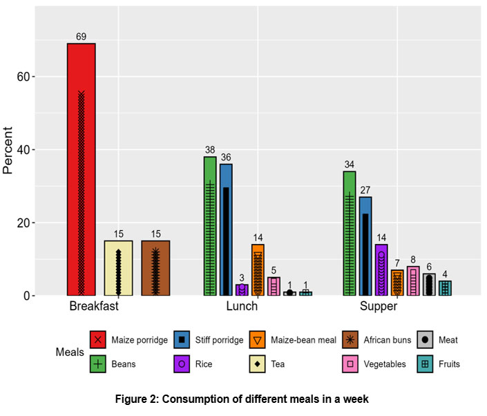 School meals were dominated by cereal grains, where the majority of both day and boarding schools reported higher use of maize (93.8%), beans (100%), rice (56.3%) and wheat (6.2%). These grains were sourced through parents’ contributions (75%) and purchases (53.1%) from markets (52.9%), individual farmers (52.9%) and registered suppliers (18.8%). Of the purchased grains, majority (75%) procured dehulled grains and flour and a small portion (25%) undehulled grains. While the majority of the schools sourced their grains within the Mvomero District (70.5%), few schools purchased grains from other places (29.4%) mainly Morogoro municipality (11.7%) and Morogoro district (5.8%) within the Morogoro region, and Kibaha district (11.7%) from Pwani region (Table 1).
