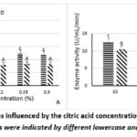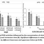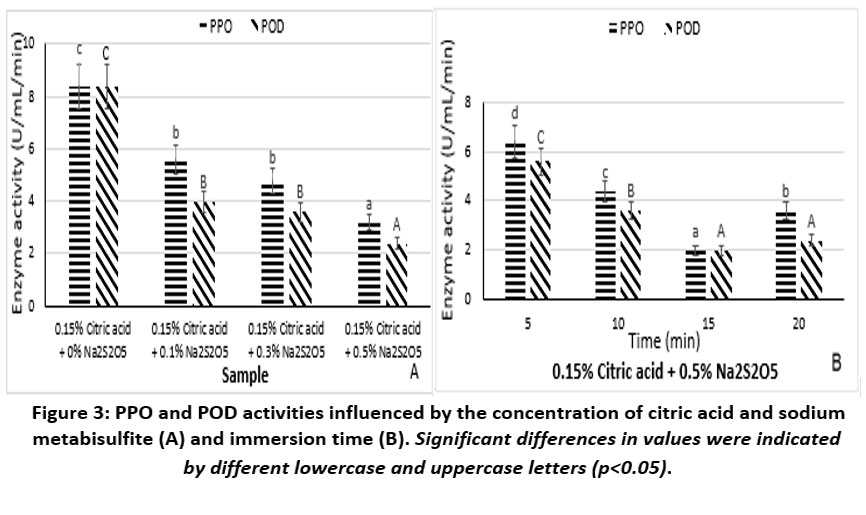 Figure 1 illustrates the activities of PPO and POD during treatment with citric acid at different concentrations and immersion times. POD activity tended to remain lower than PPO activity under all treatment conditions.
