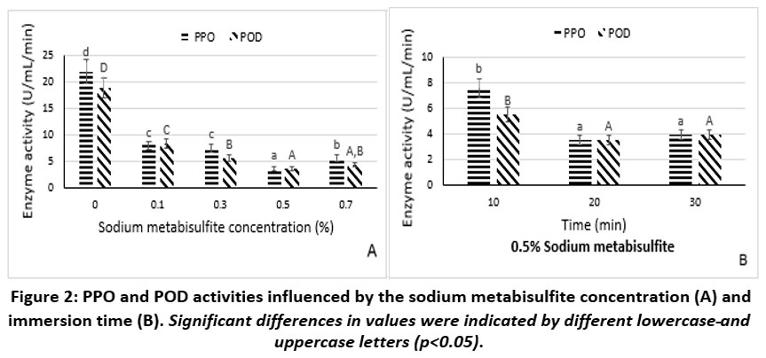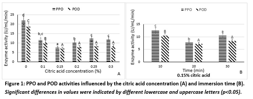 Figure 1: PPO and POD activities influenced by the citric acid concentration (A) and immersion time (B). Significant differences in values were indicated by different lowercase and uppercase letters (p<0.05).