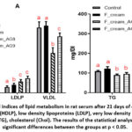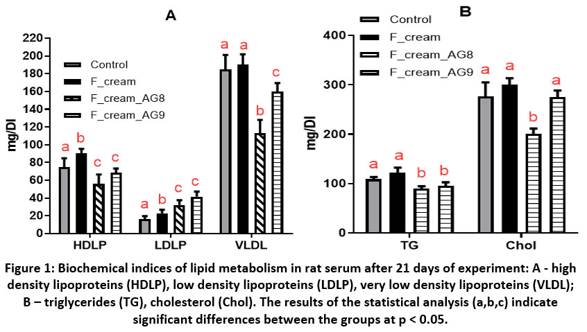 The amount of triglycerides in the blood of animals in the Fer.cream_AG8 and Fer.cream_AG9 groups was lower than in the control and sour cream groups. It should be noted that the lowest cholesterol level was observed in the group that received fermented cream of strain AG8. (Fig. 1B).
