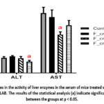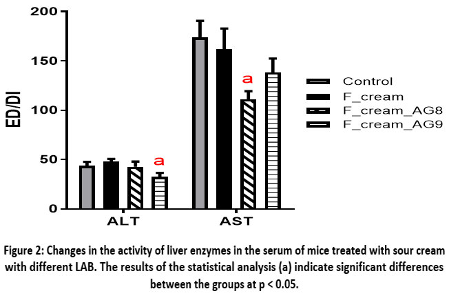 Figure 2: Changes in the activity of liver enzymes in the serum of mice treated with sour cream with different LAB. |