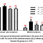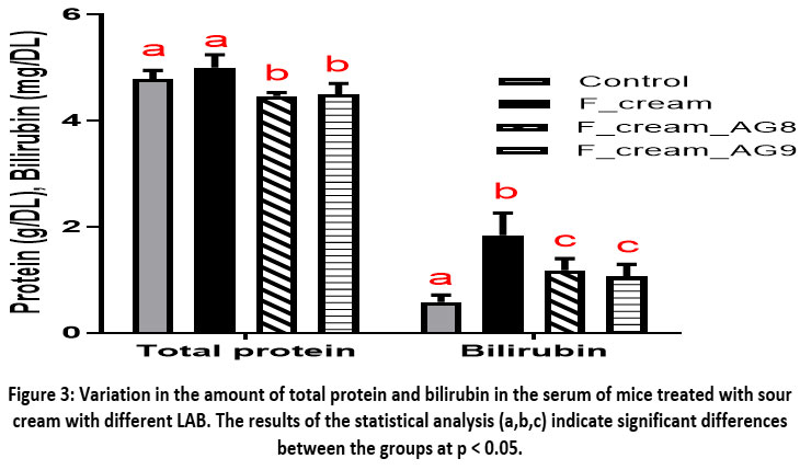 The addition of sour cream fermented by strains L.plantarum AG9 or L.fermentum AG8 to the diet slightly decreased the amount of total protein in the blood, but this indicator remained normal, although it differed from the control (Figure 3). When classical sour cream with L. cremoris and L. diacetilactis (F_cream group) was added to the diet, the amount of protein in the blood of mice increased slightly. Regular consumption of sour cream, regardless of the starter bacteria, led to an increase in bilirubin levels, but not above the normal level. It is important to note that the highest bilirubin elevation was in the classic sour cream group (F_cream group), while this index was lower in the groups with sour cream based on probiotic strains L.fermentum AG8 or L.plantarum AG9.