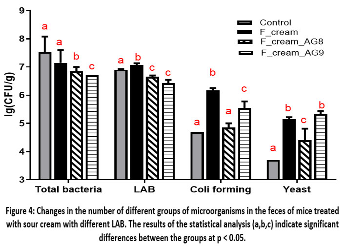 In the previous section, the objective was to elucidate the distinctive effects of sour cream made with traditional starter cultures (Lactococcus lactis subsp. cremoris, Lactococcus lactis subsp. lactis biovar diacetilactis) and sour cream obtained by fermentation with probiotic lactic acid bacteria on mice. The selection of Limosilactobacillus fermentum AG8 and Lactiplantibacillus plantarum AG9 was made on the basis of their well-documented probiotic properties.25 These strains have probiotic properties, are capable of fermenting milk and metabolic products have antioxidant properties.26-28 In addition, L. fermentum strain AG8 was found to have high antibacterial activity.29