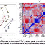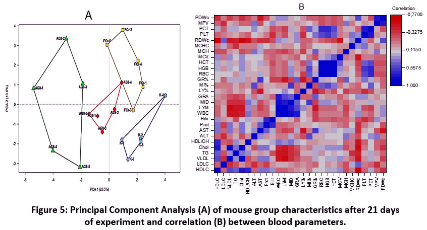 Figure 5: Principal Component Analysis (A) of mouse group characteristics after 21 days of experiment and correlation (B) between blood parameters. |