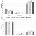 Batter quality is an important factor affecting emulsion in meat products which influences the characteristics and quality of the final product; it should remain stable during changes in temperature, pressure, and extrinsic factors during processing. The emulsion stability results (based on TFR) are shown in Figure 1A. These results showed that the ratio of SI and thermal processing affected the emulsion stability of the batters. Increasing the added amount of SI from 0% to 100% significantly reduced the TFR from 27.88% to 16.09%, respectively. The sausages with toasted SI had a lower amount of TFR compared to the sausages with roasted SI and the control. The results showed that the batters using 100% SI and toasted SI were more stable and had a strong structure for holding fluid.