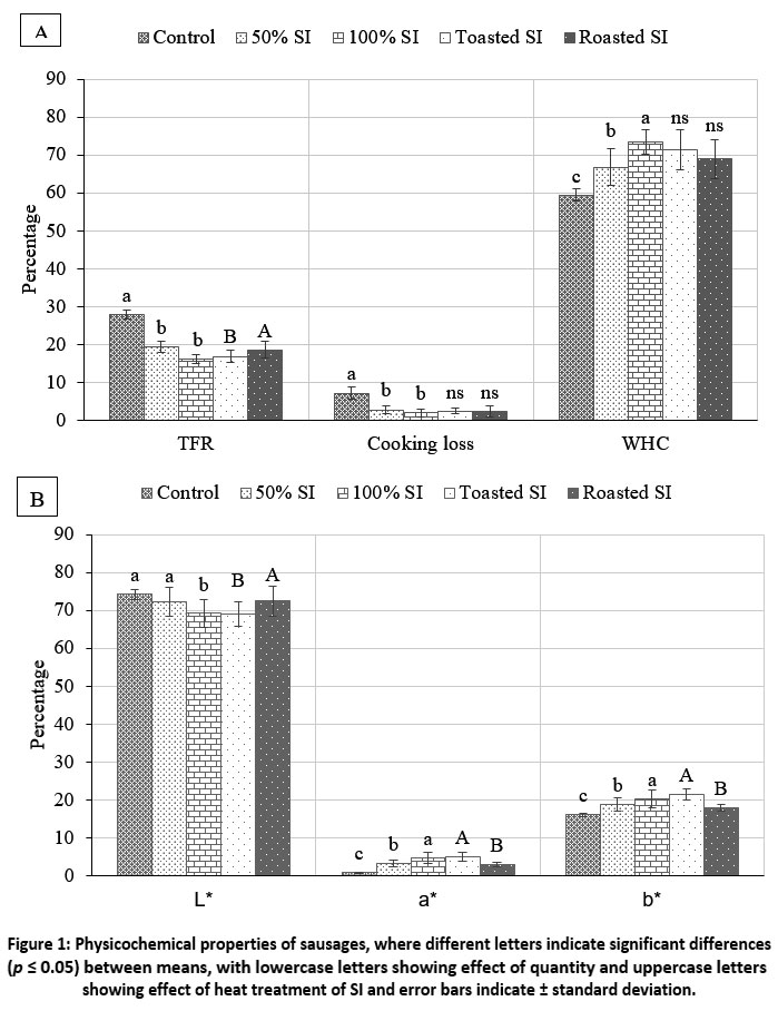 Figure 1: Physicochemical properties of sausages, where different letters indicate significant differences (p ≤ 0.05) between means, with lowercase letters showing effect of quantity and uppercase letters showing effect of heat treatment of SI and error bars indicate ± standard deviation. |