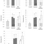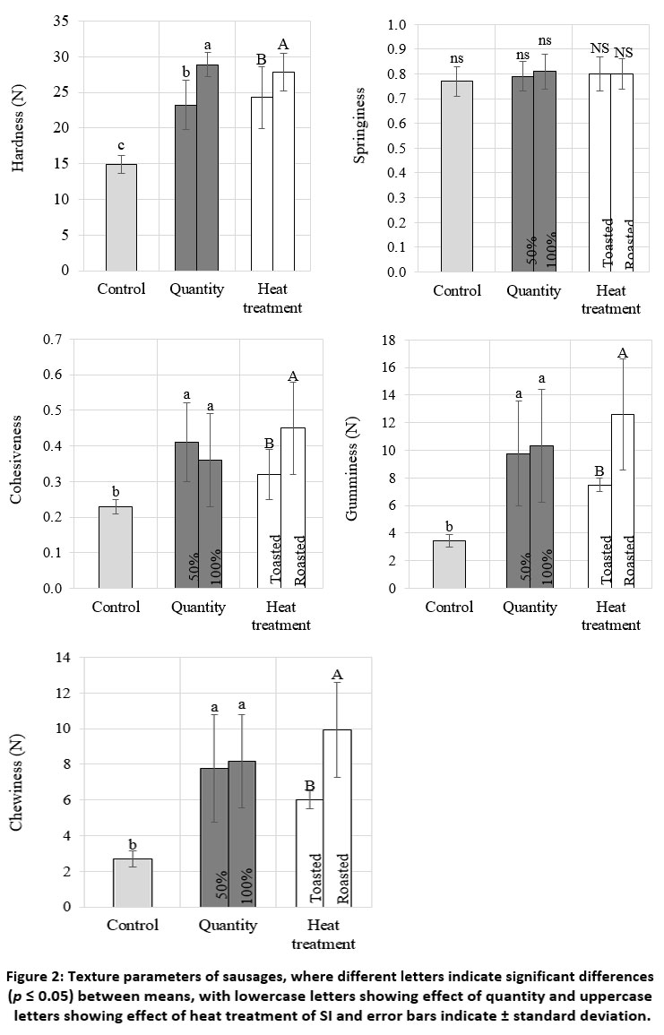Figure 2: Texture parameters of sausages, where different letters indicate significant differences (p ≤ 0.05) between means, with lowercase letters showing effect of quantity and uppercase letters showing effect of heat treatment of SI and error bars indicate ± standard deviation. |