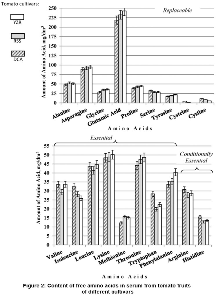 Figure 2: Content of free amino acids in serum from tomato fruits of different сultivars |