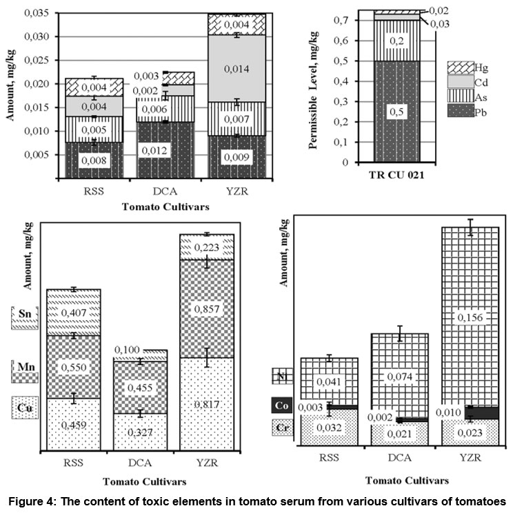 The results of the study of serum mineral composition of different varieties and colors tomatoes are presented in detail in the article by Zharkova et al.35 The ratio of Na to K in all analyzed samples of TS was in the range of 0.01-0.02, which is significantly less than 1.0 and is important for the prevention of high blood pressure. In the studied samples of TS, the ratio of Na to K turned out to be more favorable than the value of 0.38 in the samples of cherry tomatoes analyzed by Oyetayo and Ibitoye.33