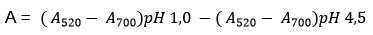 1 ml of 7.5% Parijoto extract was diluted with double distilled water at a ratio of 1:9. The diluted Parijoto extract was then mixed with 1 ml of each buffer solution (pH 1 and pH 4.5). Each sample was vortexed until homogeneous and stored in a dark room for 15 minutes. The incubated samples were measured for absorbance using a UV-Vis spectrophotometer (Shimadzu, Kyoto, Japan) at wavelengths of 520 nm and 700 nm. The absorbance (A) was calculated using the formula: