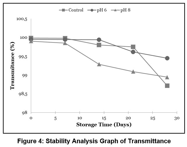 Based on the stability analysis results of the transmittance values shown in Figure 4, it was observed that all samples experienced a decrease in transmittance, although the decrease was generally not significant. At the end of the storage period on day 28, sample N8 had the lowest transmittance value compared to the other treatments, while samples N6 and Nk exhibited higher transmittance values.
