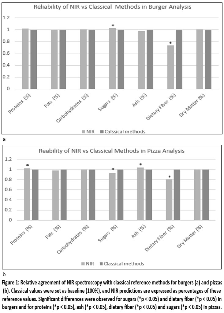 ABSTRACT:Nutritional profiling of fast-food products is essential for both consumer transparency and industrial quality control, yet conventional methods such as Kjeldahl, Soxhlet, and gravimetric assays are time consuming and require specialized laboratories. Near-infrared (NIR) spectroscopy offers a rapid and non-destructive alternative, but its reliability in complex food matrices such as burgers and pizzas remains underexplored. In this study, four types of burgers (10 samples each, three replicates) and thirteen types of pizzas (three replicates each) were analyzed using both reference methods and a Tango FT-NIR spectrometer to determine protein, fat, carbohydrates, sugars, ash, dietary fiber, and dry matter. Results indicated excellent agreement between NIR and classical methods for major components, including protein, fat, carbohydrates, and dry matter, with no statistically significant differences (p > 0.05). However, sugars showed systematic deviations, with overestimation in burgers (p < 0.05) and underestimation in pizzas (p < 0.01). Ash content also differed significantly in pizzas (p < 0.05), while dietary fiber showed the largest discrepancy, with NIR consistently underestimating values (p < 0.05). Despite these limitations, NIR displayed high repeatability, with standard deviations below 0.2% for most parameters. These findings confirm NIR as a robust and efficient tool for routine nutritional screening in fast food, though reference methods remain indispensable for sugars and dietary fiber.