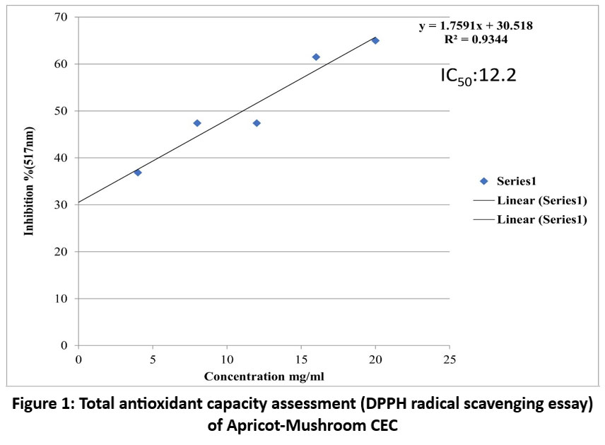 According to the procedure outlined by Öztürk et al.,24 ethanolic extracts were obtained from the Apricot-Mushroom CEC. Five grams of the sample were blended with 30mL of 75% ethanol, stirred continuously at room temperature for 2 hours, filtered through Whatman No. 1 filter paper, and then stored at 20°C until further analysis.