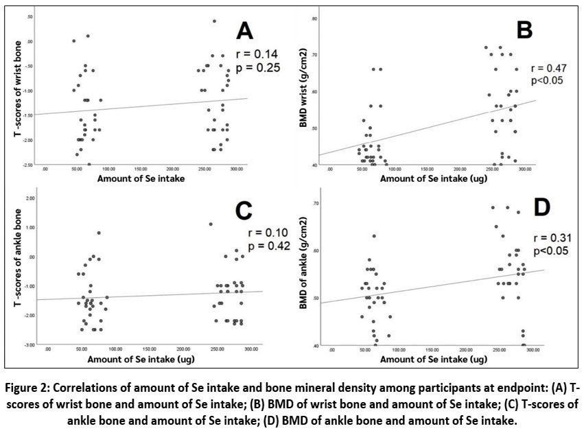 Participants’ data on sex and education were reported as percentages, and differences were assessed using Fisher’s Exact Test. Duration of weekly exercise, daily sun exposure, and other ABI and BMD scores were reported as mean ± standard deviation (SD). Skewness and kurtosis were used to assess data normality, and the Mann-Whitney U test was applied to determine significant differences between groups. Pearson correlation coefficients were used to examine the relationships between Se intake and ABI and BMD scores at the study endpoint. Statistical analyses were performed using SPSS software (version 26.0). A p-value of less than 0.05 was considered statistically significant.