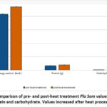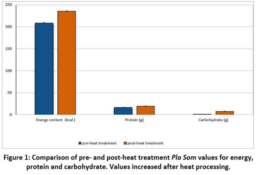 Figure 1: Comparison of pre- and post-heat treatment Pla Som values for energy, protein and carbohydrate. Values increased after heat processing.