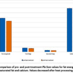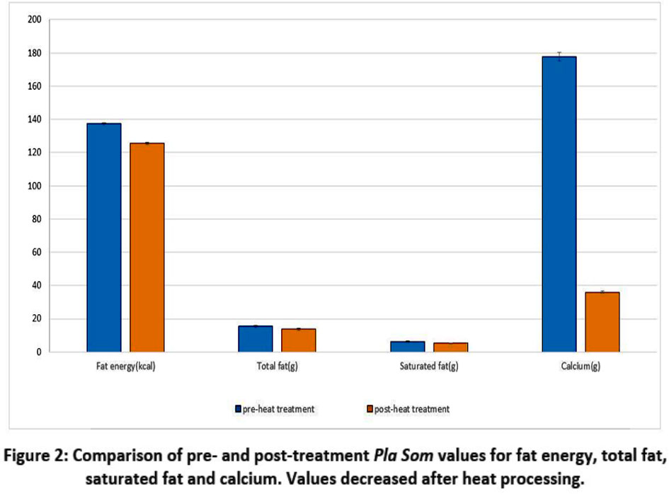 Figure 2: Comparison of pre- and post-treatment Pla Som values for fat energy, total fat, saturated fat and calcium. Values decreased after heat processing.