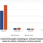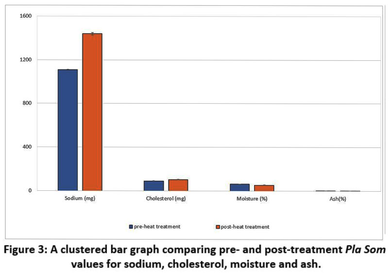 Figure 3: A clustered bar graph comparing pre- and post-treatment Pla Som values for sodium, cholesterol, moisture and ash.