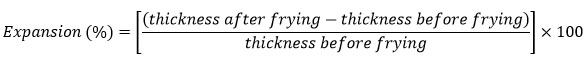 The thickness of 5 points was measured using a cross mark, and the center of each slice of tapioca crispy crackers before and after frying was measured with a Vernier caliper (Mitutoyo Vernier Caliper 530 Series, Japan) and replicated three times according to the method of Maisont et al.12 The expansion of the puffed tapioca crispy crackers was calculated as a percentage of the difference in the average value of thickness before and after frying, compared to the average value of thickness before frying.