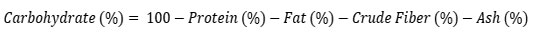 The proximate composition of the selected tapioca crispy cracker as the final product, including moisture, ash, protein, fat, crude fiber, and carbohydrate, was determined according to the methods established by AOAC(2025).10 The moisture content was determined using oven drying at 105 ºC up to constant weight. The ash content was determined in a muffle furnace at 550 ºC until a white or light grey ash was obtained. The protein content was analyzed using the Kjeldahl technique, applying a nitrogen-to-protein conversion factor of 6.25. Fat content was measured through manual Soxhlet extraction. Crude fiber was assessed by igniting the dried residue left after sample digestion, with the fiber amount determined by the change in weight. Carbohydrates were estimated by subtracting the total of other measured components. All results were expressed as grams per 100 g of dry matter.