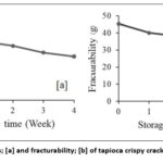Figure 2: Hardness; [a] and fracturability; [b] of tapioca crispy crackers during storage |