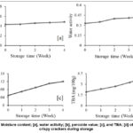 According to the hardness analysis of the tapioca crispy crackers with fairy mushrooms substituted 250 g from Figure 2[a], it was observed that the product’s hardness decreased with an increase in storage period. This softening corresponded with an increase in moisture content over time (Figure 3[a]). This behavior has also been documented by Morais et al.27 The changes undergone by food hardness are directly linked to structural changes undergone during its storage. All samples were kept in the same condition in thick polypropylene plastic bags. Water, due to its plasticizing effect, is one of the main elements responsible for these changes; thus, increasing moisture resulted in a consequent reduction of the cracker hardness. It may be due to the crackers absorbing moisture from the atmosphere, which usually leads to the softening of the crackers, and the speed of moisture pick-up is related to the ambient conditions, as reported by Romeo et al.28