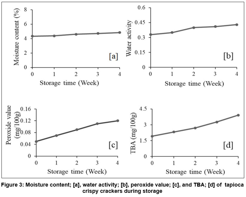 Figure 3: Moisture content; [a], water activity; [b], peroxide value; [c], and TBA; [d] of tapioca crispy crackers during storage |