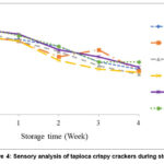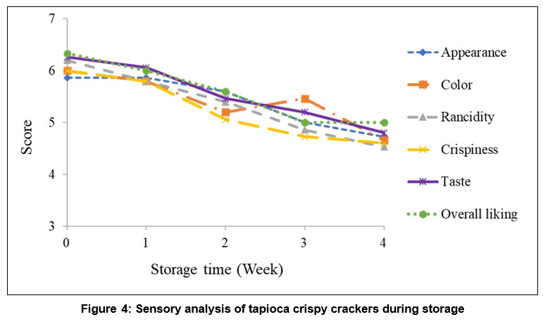 Figure 4: Sensory analysis of tapioca crispy crackers during storage |