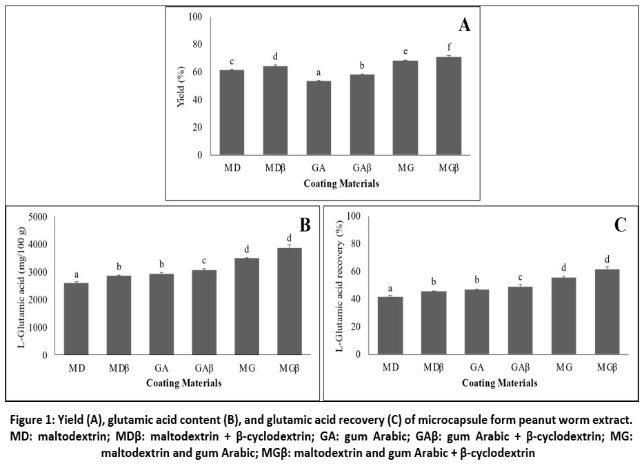 Figure 1: Yield (A), glutamic acid content (B), and glutamic acid recovery (C) of microcapsule form peanut worm extract. |