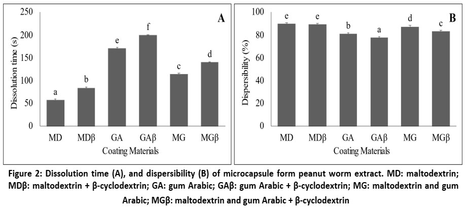 Figure 2: Dissolution time (A), and dispersibility (B) of microcapsule form peanut worm extract. |