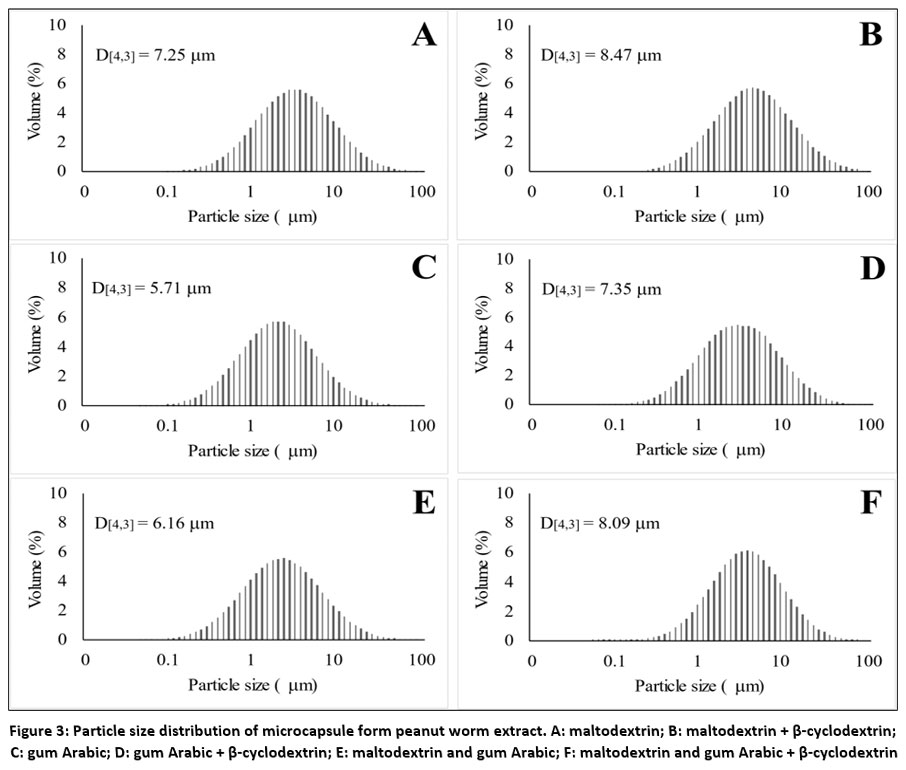 Figure 3: Particle size distribution of microcapsule form peanut worm extract. A: maltodextrin; B: maltodextrin + β-cyclodextrin; C: gum Arabic; |