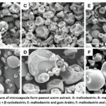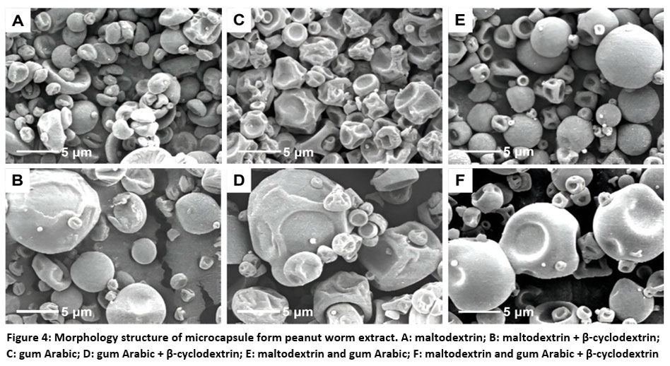 Figure 4: Morphology structure of microcapsule form peanut worm extract. A: maltodextrin; B: maltodextrin + β-cyclodextrin; C: gum Arabic; |