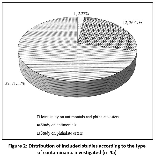 Figure 2: Distribution of included studies according to the type of contaminants investigated (n=45). |