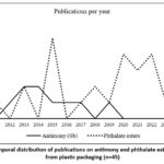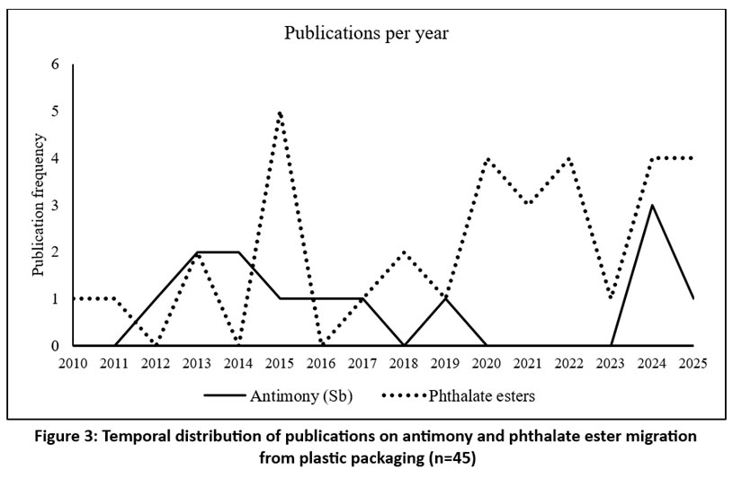 Figure 3: Temporal distribution of publications on antimony and phthalate ester migration from plastic packaging (n=45). |
