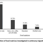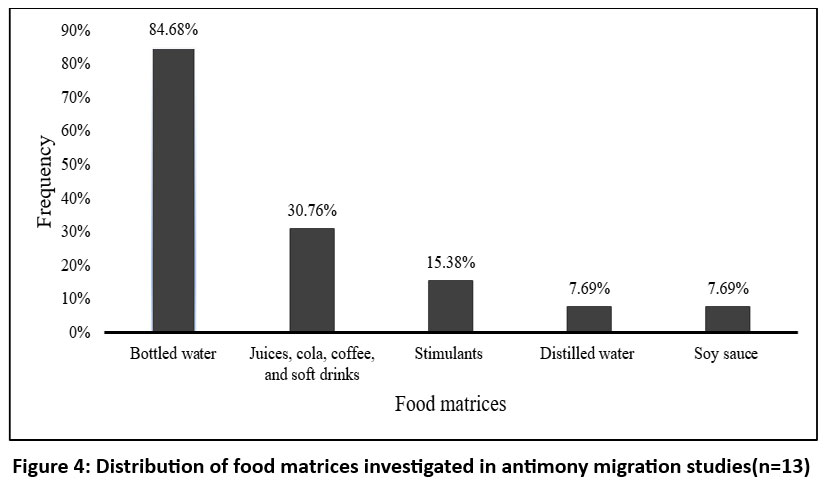 Fig 4 (Distribution of food matrices investigated in antimony migration studies) illustrates the distribution of food types and simulants examined across the 13 included articles. The majority of studies focused on bottled water, representing 84.68% of the cases. Other beverages, including juices, cola, coffee and soft drinks, accounted for 30.76% and stimulants accounted for 15.38%. Distilled water was reported in 7.69% of studies, while soy sauce was also addressed in a single investigation (7.69%). This highlights that water, particularly mineral and drinking water, has been the primary focus of Sb migration research, whereas other beverages and specific food matrices remain less explored.