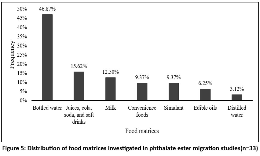 Taken together, these findings clearly establish that storage time is a critical factor driving PAE release, regardless of matrix or polymer type. Short-term storage may result in low but detectable migration, while medium- and long-term storage substantially increase phthalate concentrations, especially for lipophilic compounds such as DEHP, DINP, DIDP, and DNOP. This cumulative effect has been consistently demonstrated in bottled water,6,8,48 beverages,20,25,33 milk,21,26,32,41 oils,3,49 and simulants,43,45-46 demonstrating a robust and universal time-dependent migration pattern.