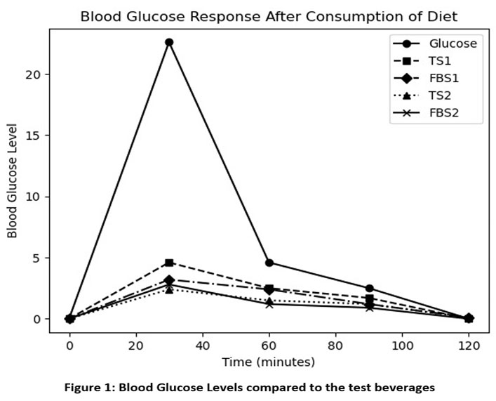 Fifty grams (50g) of commercial glucose powder (glucose-D) was dissolved in 250 mL of water (standard measure). Similarly, 50g carbohydrate equivalents (790g, 1250g, 720g, 390g) for the test beverages (TS1, TS2, FBS1, and FBS2) were measured using an electronic scale (SF-400, Capacity 7000g x1g/248oz.1oz), diluted in 250 mL of water (standard measure), and served to the subjects. Due to the thickness of the samples, participants were allowed to add extra water according to their taste preferences and consumed the beverages in a relaxed position over 15-25 minutes. Blood glucose levels were then recorded at 30-minute intervals, starting from the time each subject finished their drink. Before administering the reference and test beverages, subjects’ fasting blood glucose levels were recorded. The blood glucose levels of subjects were measured using a glucometer (ACUCheck Active (SN-BB27084924-Germany) Capillary blood glucose was measured from finger-prick (left-hand) of each subject, all through the process. The baseline (0 mins) blood samples were obtained from subjects after 12-hour fasting and at 30, 60, 90 and 120 min, over 2-hour period, after the consumption of each test diet. Subjects were allowed to drink only water between testing intervals. Subjects had a day rest after each test and the process lasted for 10 days.