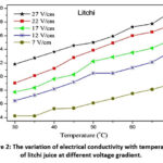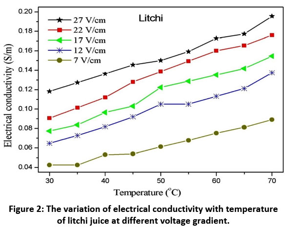 Figure 2: The variation of electrical conductivity with temperature of litchi juice at different voltage gradient.