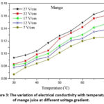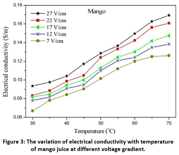 Figure 3: The variation of electrical conductivity with temperature of mango juice at different voltage gradient.