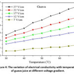 Figure 4: The variation of electrical conductivity with temperature of guava juice at different voltage gradient.