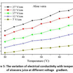 Fig. 5. The variation of electrical conductivity with temperature of aloevera juice at different voltage   gradient.