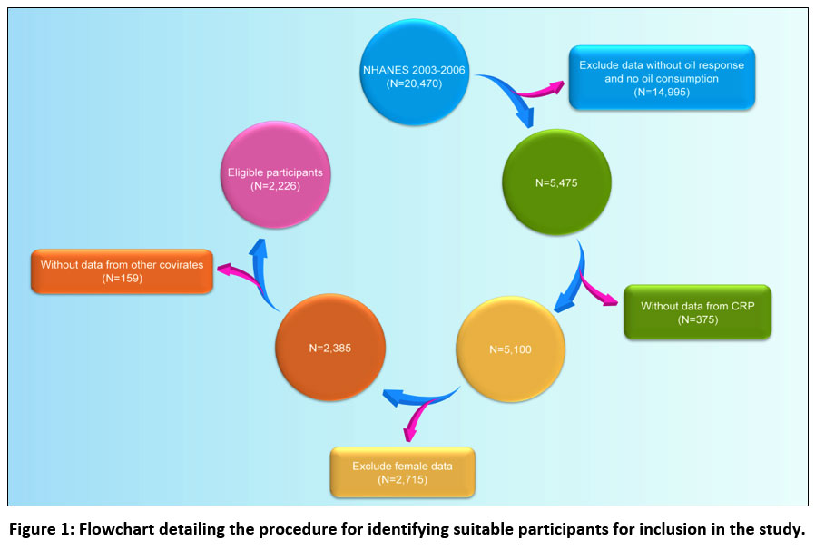 Data extraction was conducted using the NHANES database, which included 20,470 participants, covering the period from 2003 to 2006. The following criteria were established for exclusion: elimination of records that did not have information on oil response or oil consumption (14,995 cases), absence of CRP data (375 cases), exclusion of female participants (2,715 cases), and data lacking additional covariates (159 cases). In total, 2,226 people satisfied the eligibility requirements and were incorporated into the study, as stated in Figure 1.