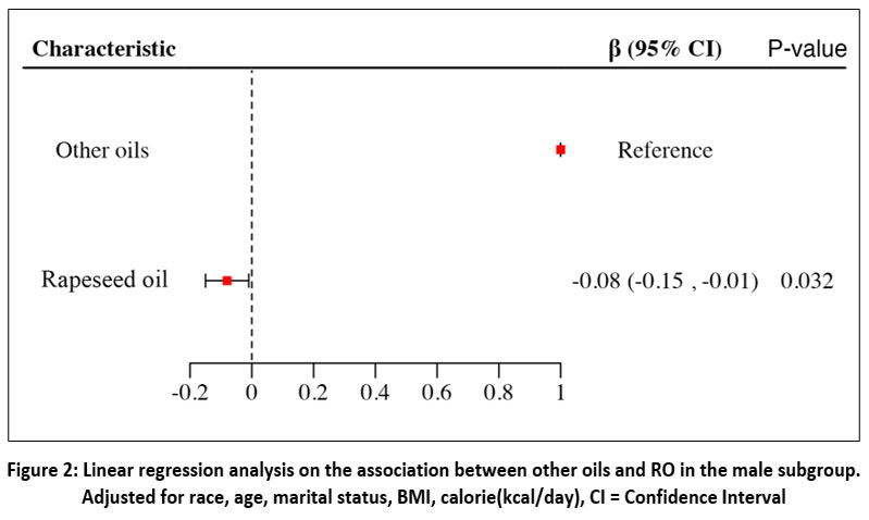 Figure 2: Linear regression analysis on the association between other oils and RO in the male subgroup. Adjusted for race, age, marital status, BMI, calorie(kcal/day), CI = Confidence Interval. |